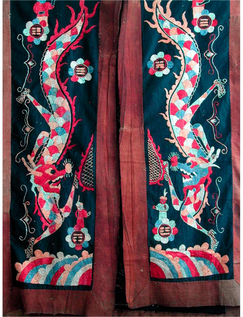 I motivi che sono ricamati sulla veste,(eseguiti con filo di seta) rappresentano il Paradiso dei Taoisti (the Heavens of the Taoist stellar gods) oltre ad altri simboli della religione taoista.